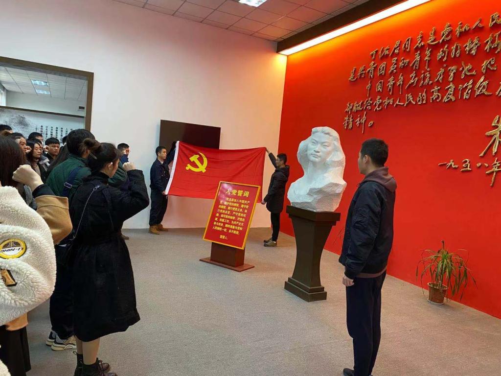 参观结束后,师生党员们在纪念馆内,重温入党誓词。全体党员在党旗前庄严宣誓,对党忠诚,为共产主义事业而奋斗。