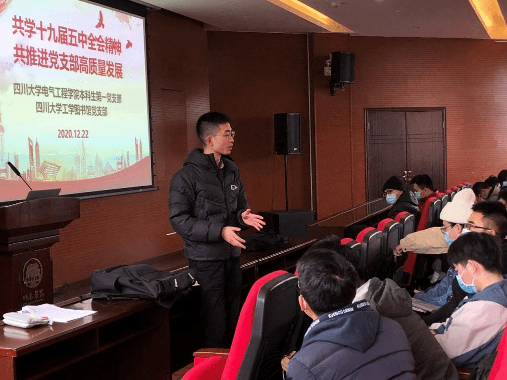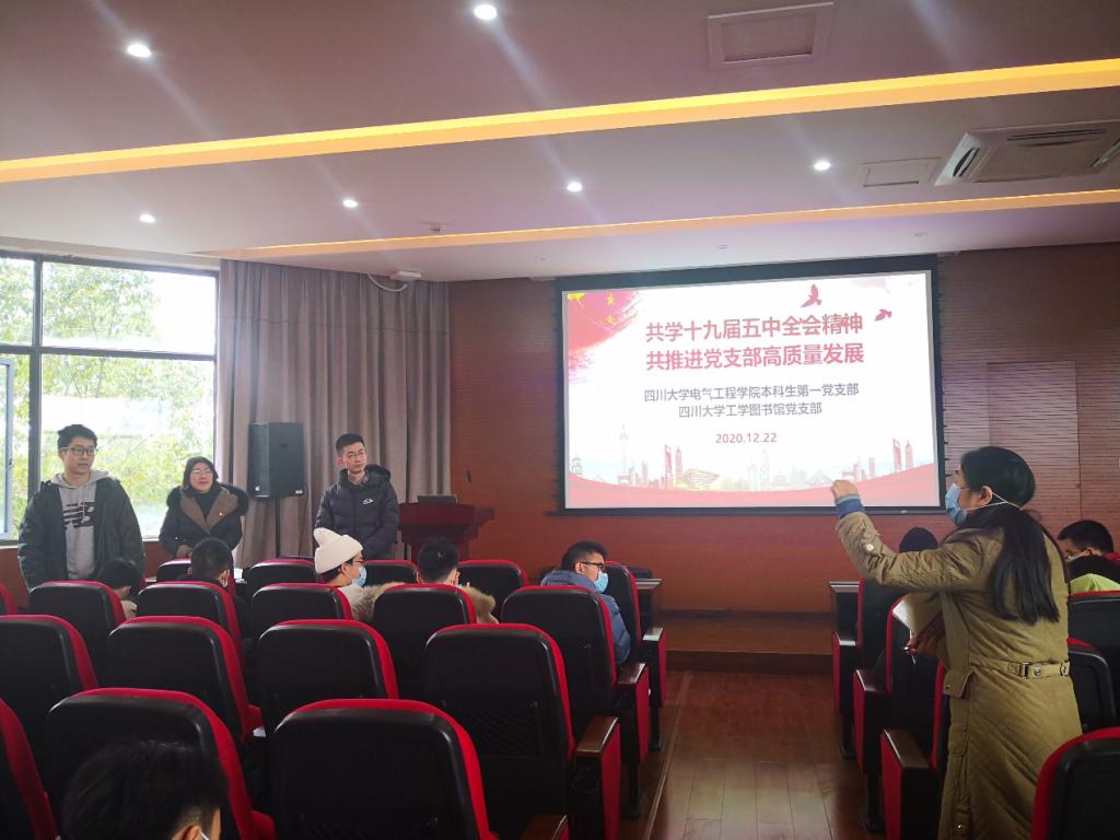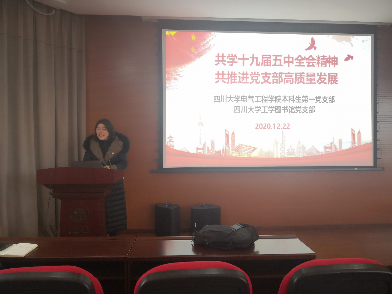 为深入学习贯彻党的十九届五中全会重要精神,推进党支部高质量发展,2020年12月22日上午,四川大学英国上市公司365本科生第一党支部与四川大学工学图书馆党支部联合举办了学习全会精神的主题党日。活动由工学图书馆党支部书记杜小军同志主持。