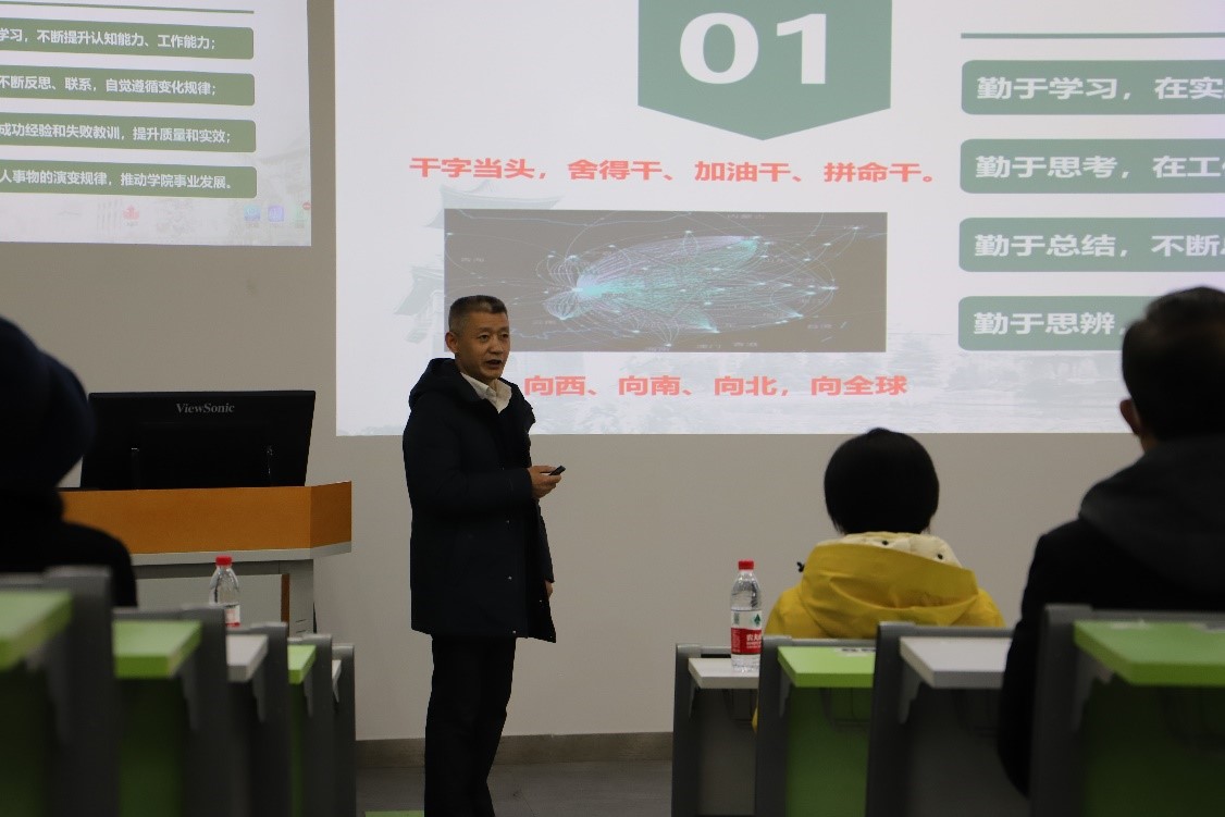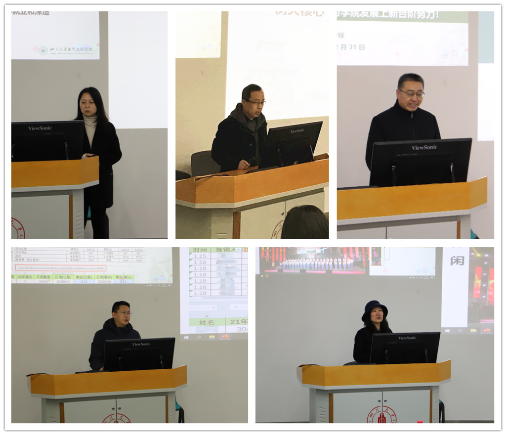 学院其他领导也就自身分管领域工作作了汇报和述职。戴婷婷副书记以“合力思政、培根树人”主题向全体教师汇报了学院学生全面发展的相关工作;李长松副院长总结了本年度本科教育工作情况和学院下年度重点工作计划;周步祥副院长汇报了学院科研工作情况;李成鑫副院长从财经工作、国资管理、日常保障等方面进行汇报;张英敏副书记向大家汇报了纪检、工会、离退休和关工委、统战等方面的工作,并作2021年违规违纪案例通报,号召大家行端品正、戒奢以俭、廉洁自律,风清气正过年节。