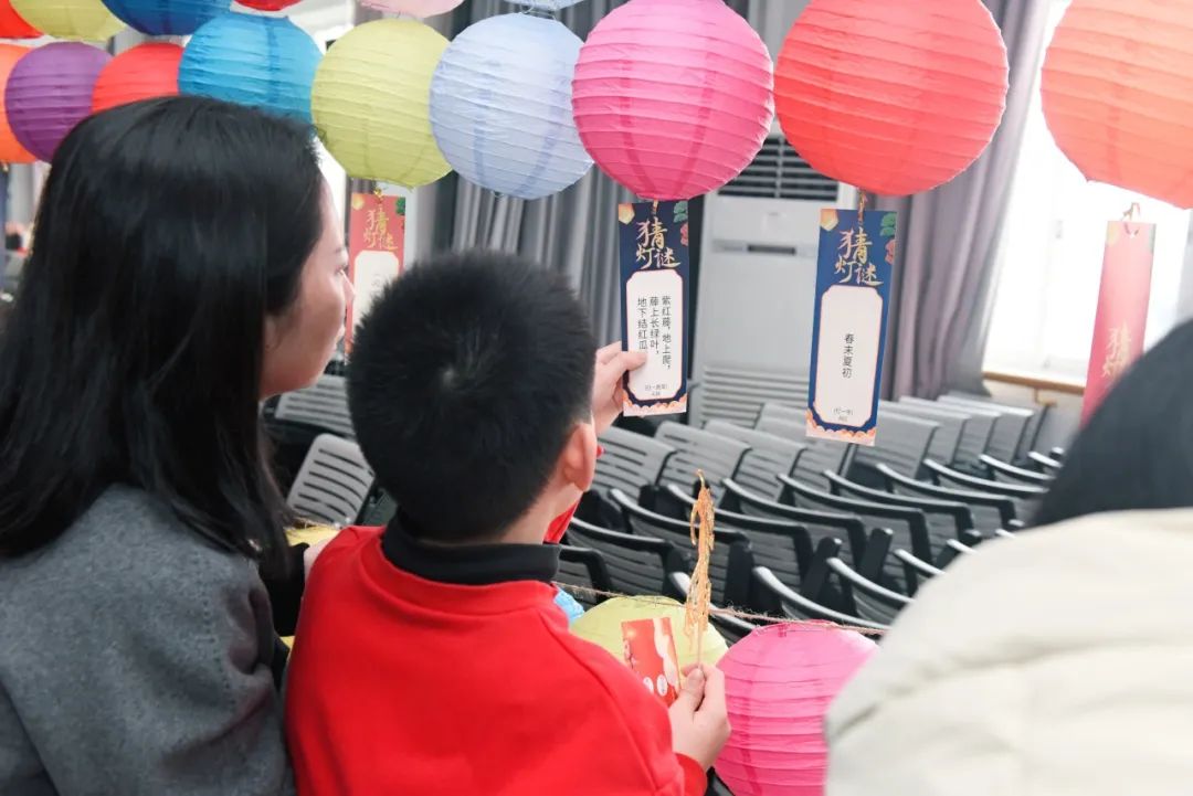 “猜灯谜”区域,一张张写满谜题的纸条在微风中轻轻飘动,老师们或驻足沉思,或与身旁同事热烈讨论,思维的火花在交流中不断碰撞。