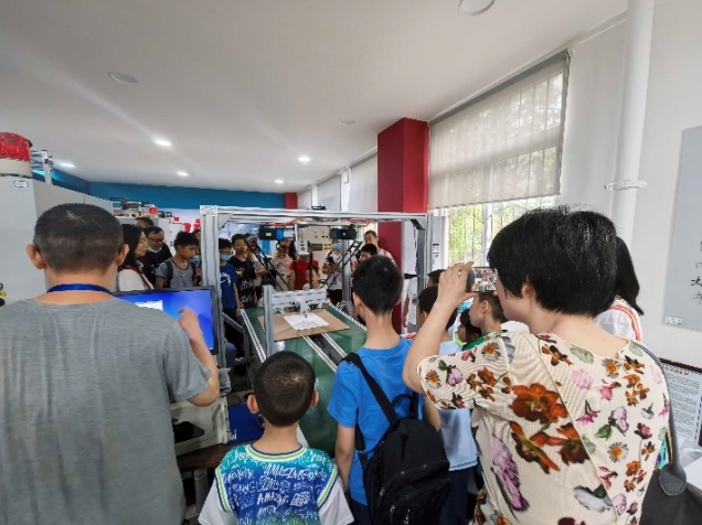 来到三楼罗克韦尔实验室,黄涛老师讲解工业机器臂娴熟的绘画技艺,三支机械臂精确操控画笔在画纸上画出太阳公公的卡通形象,引起小朋友们一片惊叹。智能车协会的成员们向小朋友们简单介绍智能车的相关知识,其自由灵活的运动轨迹吸引了小朋友们的注意力。在志愿者的指导下,小朋友们也亲自动手,操控智能车进行移动。