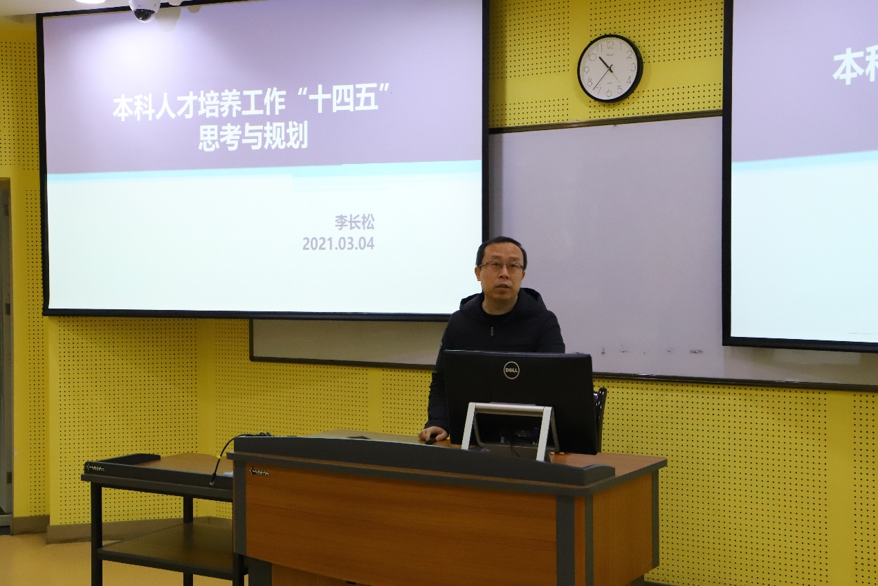 34日上午,学院召开了2020-2021学年春季学期零周工作会暨新学期工作布置会,以“聚焦‘高质量、内涵式’高层次人才培养,推动新时代人才教育改革与发展”为主题,学习贯彻学校2021年度工作布置会和双代会精神,传达学校、学院关于人才培养工作的思路与要求,学院全体教职工参加了本次会议。会上,李长松副院长就本科人才培养工作“十四五”思考与规划做了主旨发言,分析了在“十四五”开局之年本科教学所处的阶段和面临的挑战,结合学校“十四五”发展目标和主要建设任务,提纲挈领地指出了学院本科教学年度总体工作思路,并详细梳理了重点任务和主要工作。