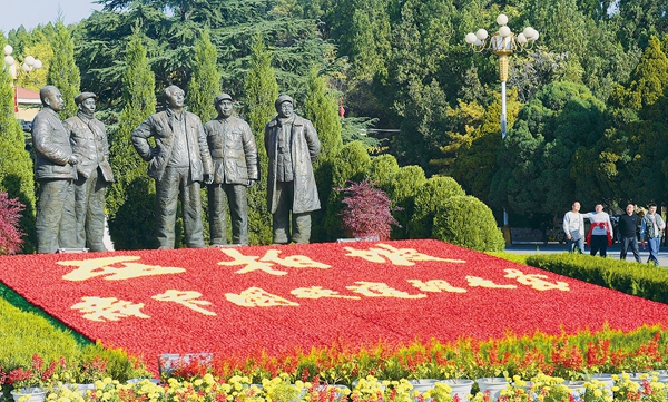 1948年9月,党中央在西柏坡召开九月会议,强调要加强党的集中统一领导和组织纪律性,为即将到来的革命在全国范围内的胜利创造了重要条件。图为游客在河北西柏坡纪念馆广场参观。新华社发(王晓 摄)