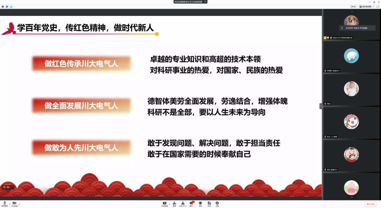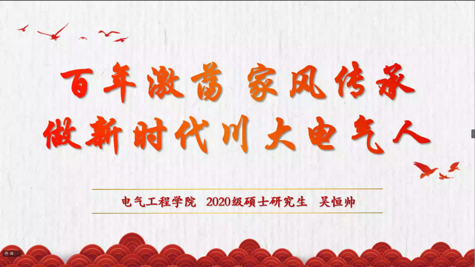 20211024日晚,四川大学英国上市公司3652021级研究生党史学习教育主题综合素质课在线上举行。课程邀请到我院2020级硕士生吴恒帅结合红色家风,讲述身边党史故事,突显了党史学习教育的深刻意义。2021级全体研究生参加了本次活动,辅导员胡劼老师主持本次课程。