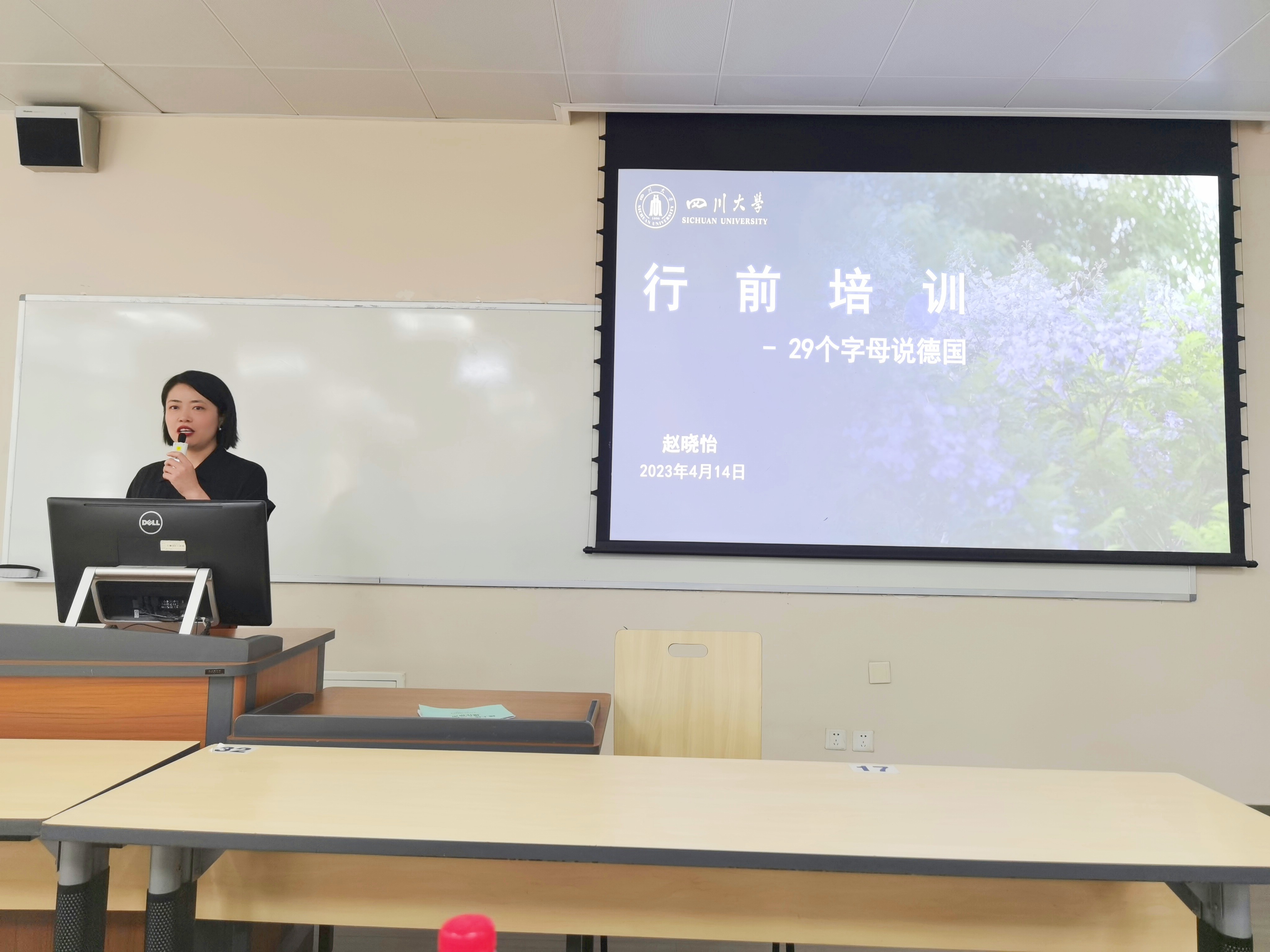 随后,赵晓怡老师以29个德语字母为引子,通过自身经验为同学们生动有趣的介绍了在德学习和生活的注意事项,分享了自己在德国的留学经历,并提醒同学们要注意平衡学习压力,将身心健康放在首位。
