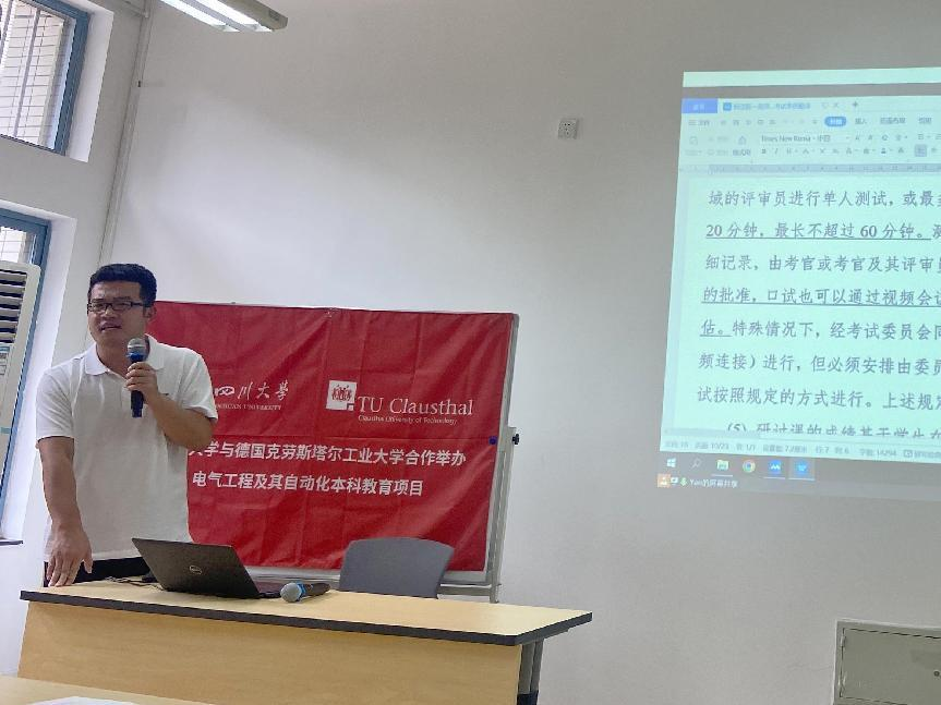 我院电气中德项目首届中德班学生将于今年暑期赴德国克大开始学习。2023年6月2日下午,2021级中德班“赴德学习及升学指导”主题班会在江安校区二基楼B103教室顺利举行。英国上市公司365院长助理陈实,中德项目行政管理、辅导员老师及2021级中德班全体学生参加了本次班会。班会由中德项目辅导员朱愉田老师主持。