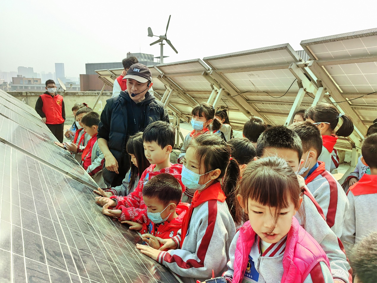 顶楼上阳光明媚,春风和煦。小朋友们到达顶楼参观了真正的光伏板和风机模型,在亲手制作模型的基础上,肖勇老师介绍了光伏发电与风力发电背后的原理。通过理论与实践相结合,小朋友们对新能源发电有了更深入的理解。