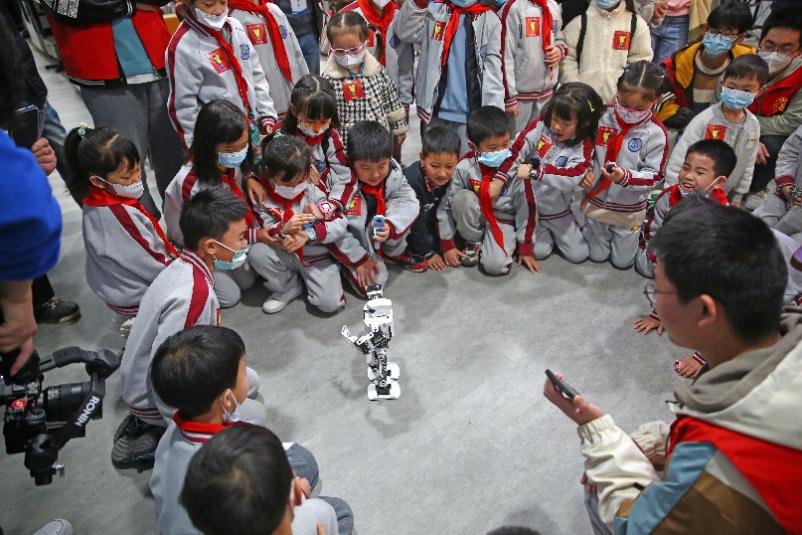 来到三楼罗克韦尔实验室,黄涛老师讲解工业机器臂娴熟的绘画技艺,三支机械臂精确操控画笔在画纸上画出太阳公公的卡通形象,引起小朋友们一片惊叹。机器人足球协会的成员们向小朋友们简单介绍机器人的相关知识,跳舞机器人灵动精妙的舞姿吸引小朋友们的注意力。在志愿者的指导下,小朋友们也亲自动手,操控机器人进行俯卧撑运动。