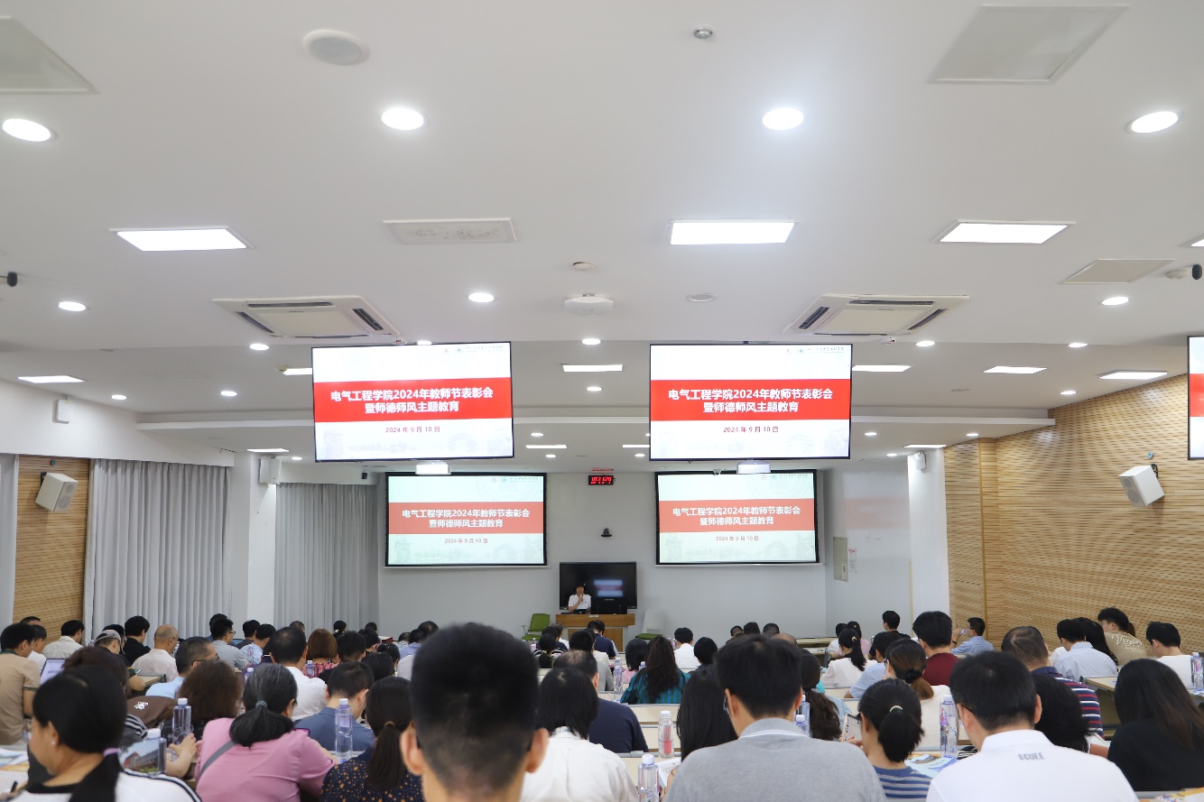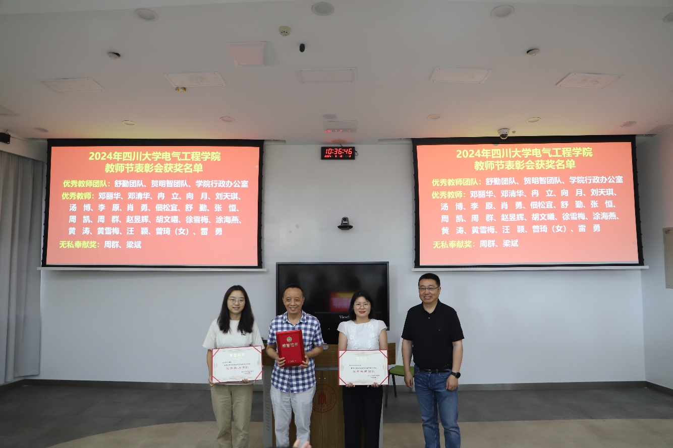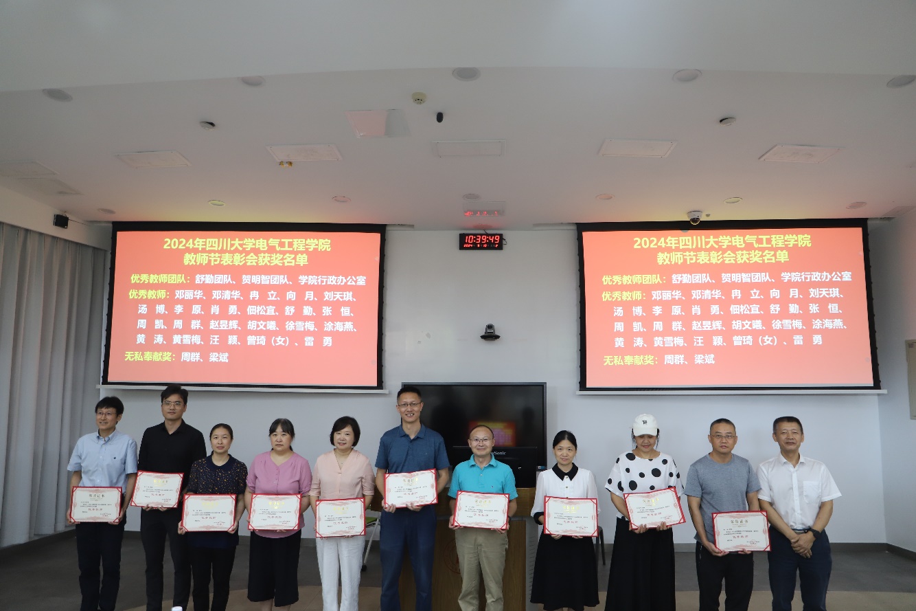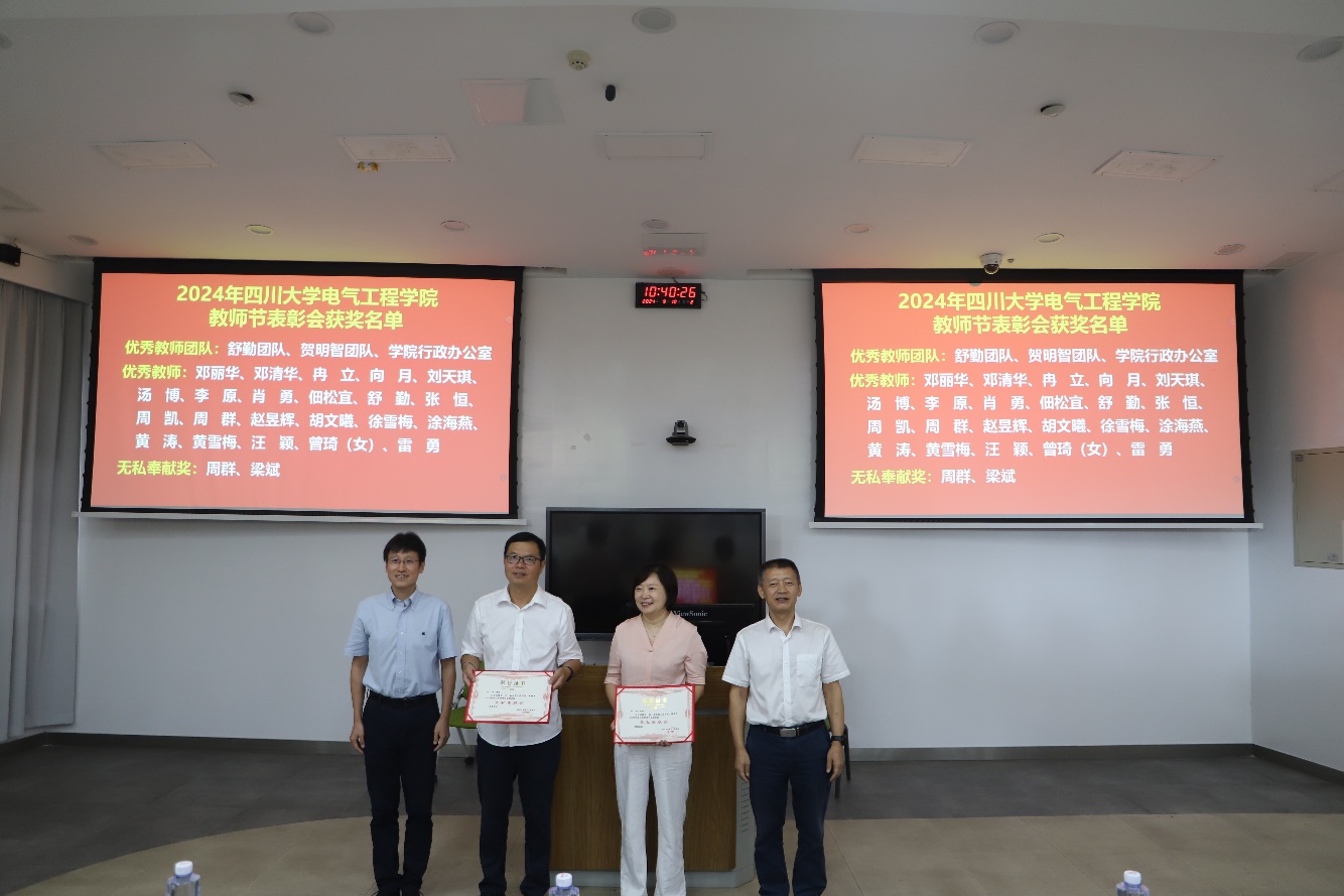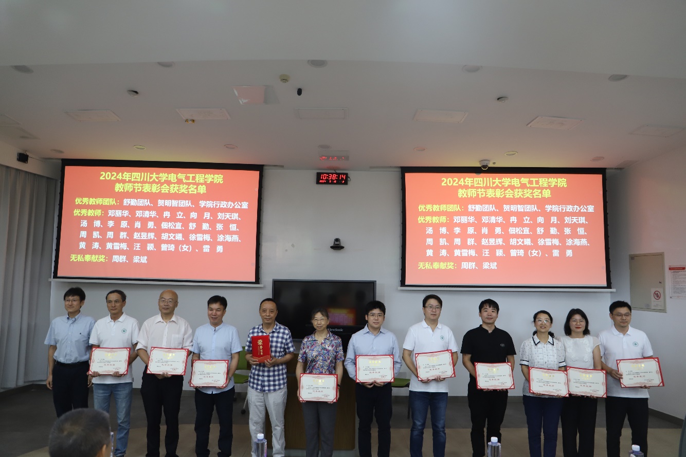 学校“姜维平优秀教学奖”获得者曾成碧教授、学院“优秀教师团队”代表舒勤教授、学院“优秀教师”代表周凯教授、学院“无私奉献奖”代表周群教授分别作了发言,他们分享了自己对教书育人事业的感悟、热爱与追求,表示将继续传承和弘扬一代代川大电气人的高尚师德风范,潜心教书育人,静心科研创新,肩负起“为党育人、为国育才”的光荣使命。