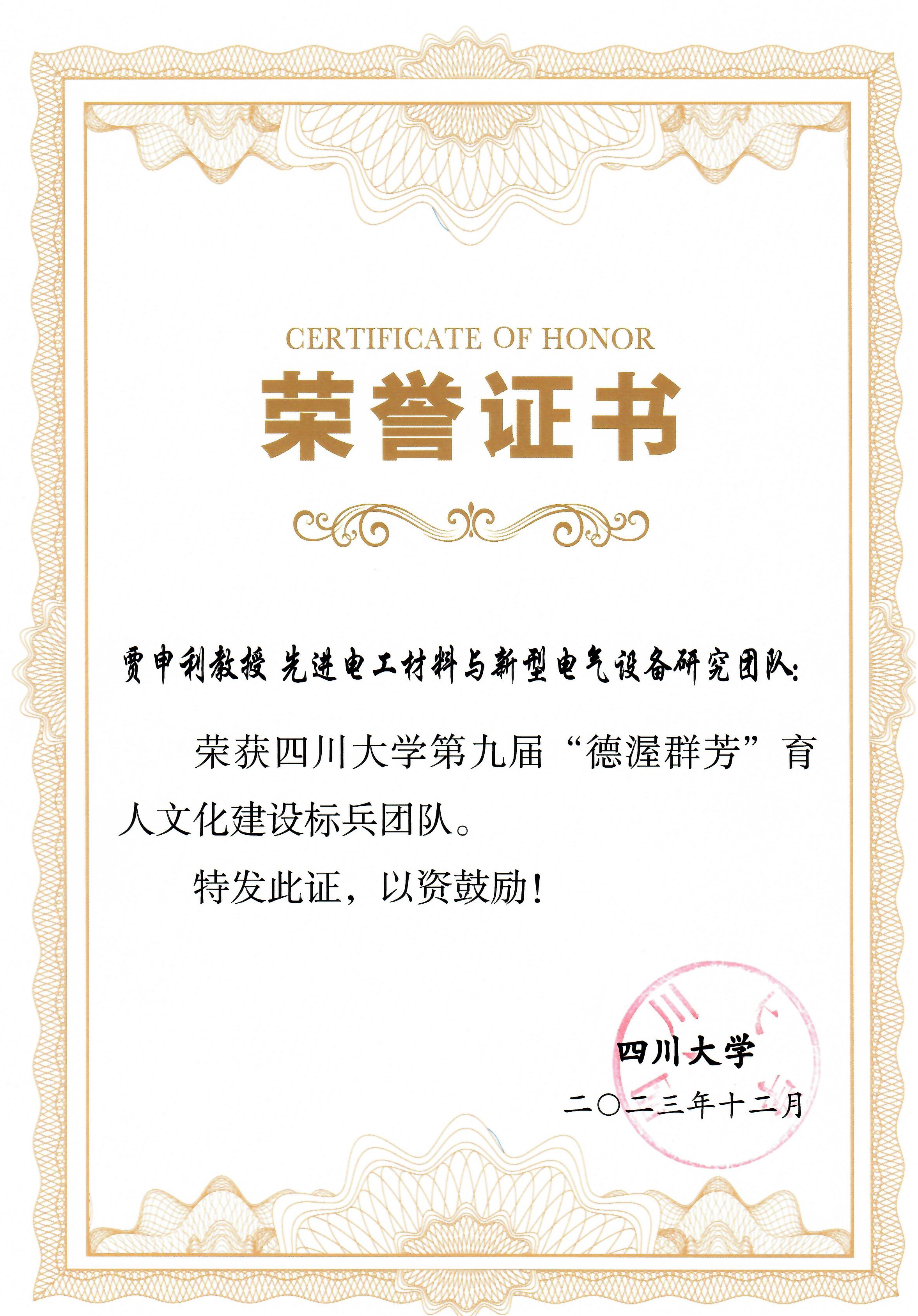 近日,我院贾申利教授先进电工材料与新型电气设备研究团队荣获“四川大学第九届‘德渥群芳’育人文化建设导师标兵团队”称号。
