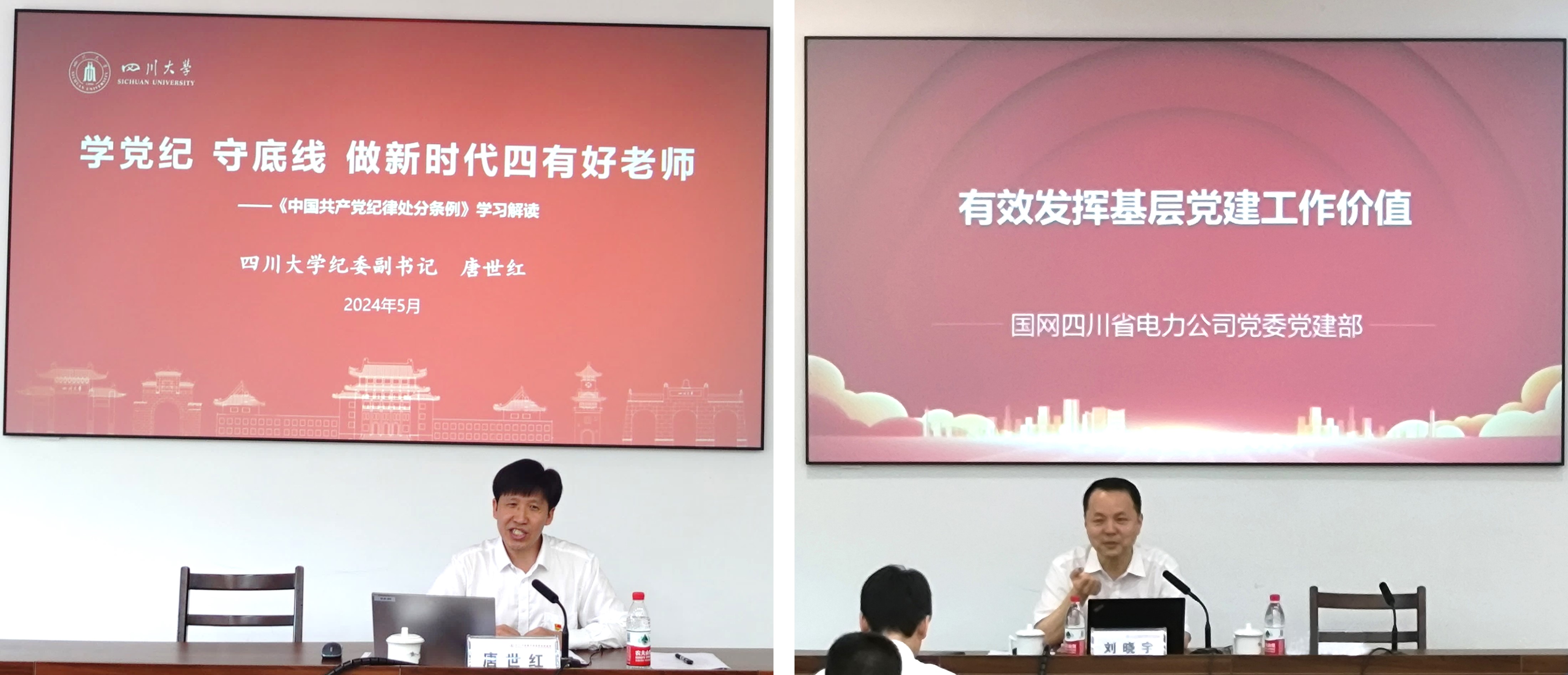 在专题培训环节,校纪委副书记唐世红作了题为《学党纪 守底线 做新时代四有好老师》的党纪学习教育专题辅导报告,国网四川省电力公司党建部主任刘晓宇作了题为《有效发挥基层党建工作价值》的辅导报告。